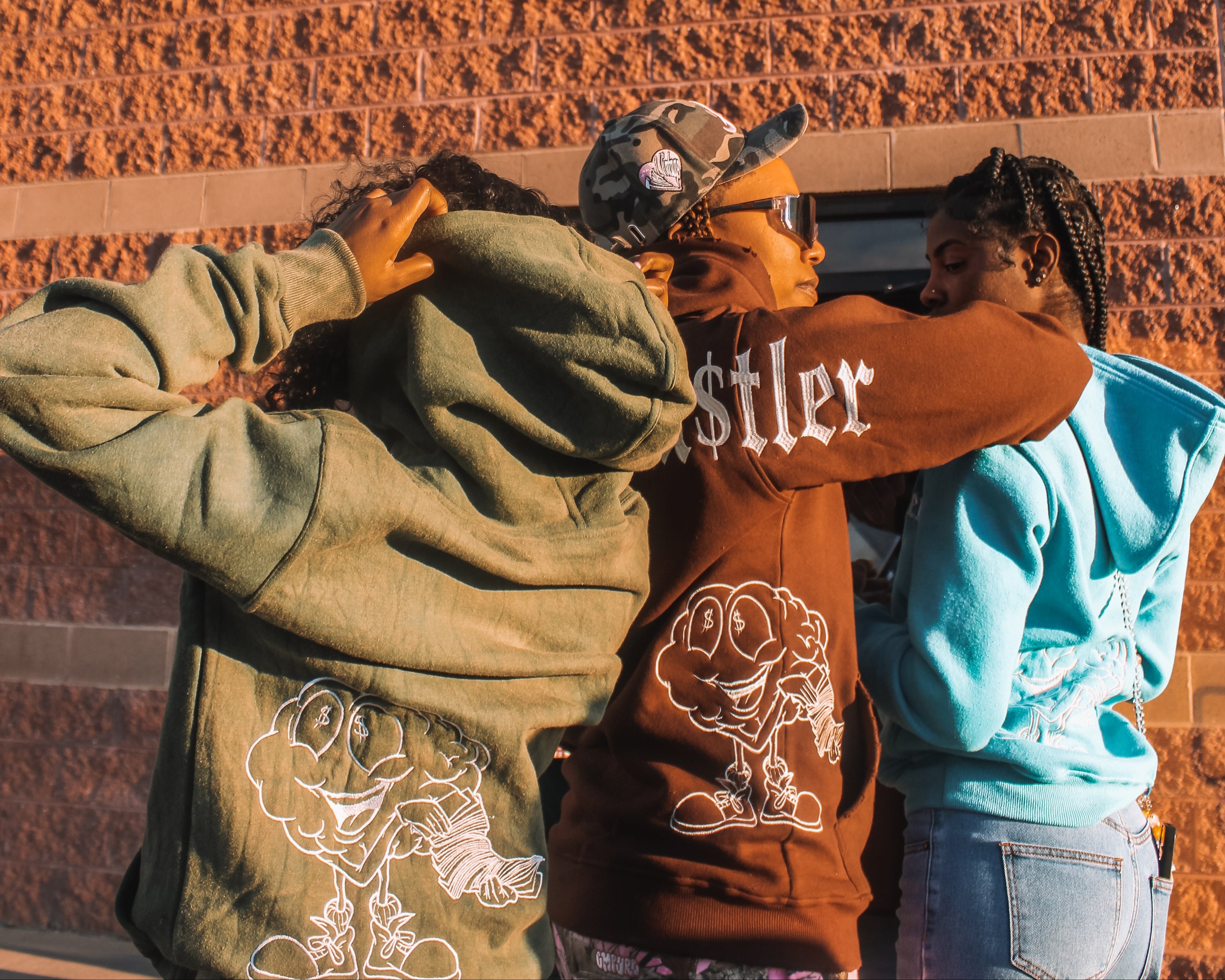 Our windbreaker sets include many custom features. The zipper on the front of the jacket is a money sign, followed by 2 "H" on each pocket. On the left sleeve you will find a small pocket with our logo embroidered on top.